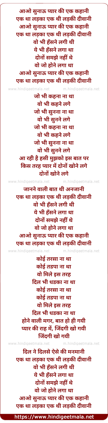 Lyrics of Aao Sunau Pyar Kee Ek Kahanee - आओ सुनाऊ प्यार की एक कहानी