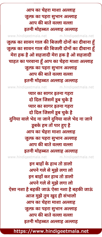 Lyrics of Aap Ka Chehra Masha Allah - आप का चेहरा माशा अल्लाह