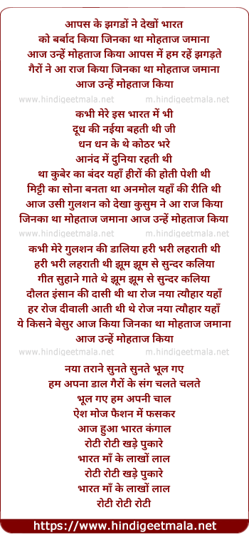 Lyrics of Aapas Ke Jhagdo Ne Dekho Bharat Ko - आपस के झगडों ने देखों भारत को