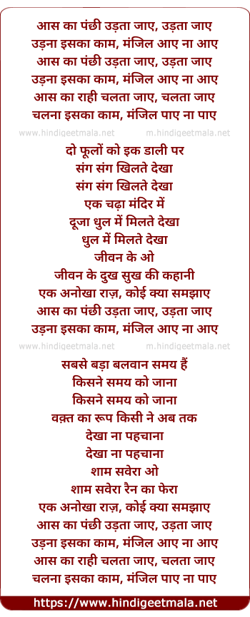 Lyrics of Aas Ka Panchhi Udta Jaye - आस का पंछी उड़ता जाए