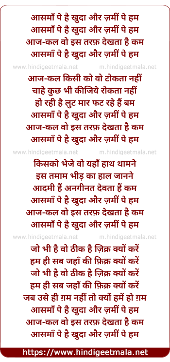 Lyrics of Aasamaan Pe Hai Kudaa Aur Zamin Pe Ham - आसमाँ पे है खुदा और ज़मीं पे हम