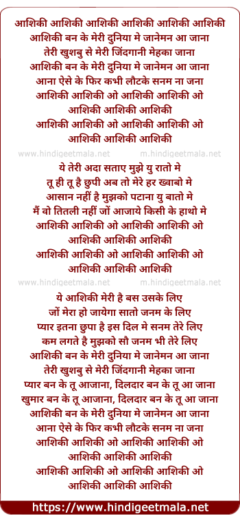 Lyrics of Aashiki Ban Ke Meri Duniya Me Janeman Aa Jana - आशिकी बन के मेरी दुनिया मे जानेमन आ जाना