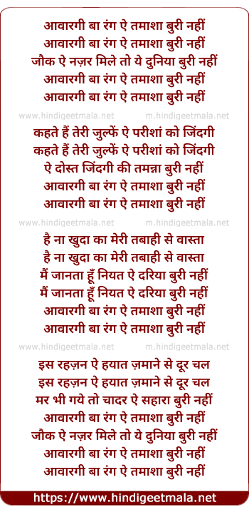 Lyrics of Aawaaragi Ba Rang E Tamaashaa Buri Nahin - आवारगी बा रंग ऐ तमाशा बुरी नहीं