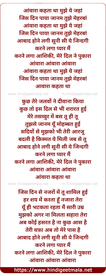 Lyrics of Aawara Kehta Tha Mujhe Yeh Jahan - आंवारा कहता था मुझे ये जहां