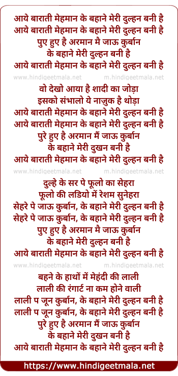 Lyrics of Aaye Barati Mehman, Ke Behana Meri - आये बाराती मेहमान, के बहना मेरी