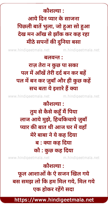 Poetic Translation - Lyrics of Aaye Din Pyar Ke Sajna - कौशल्या :