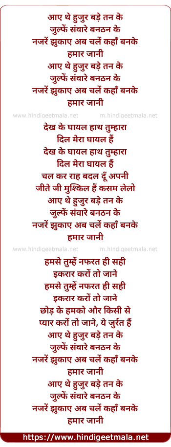 Lyrics of Aaye The Huzoor Bade Tan Ke (Female) - आए थे हुजुर बड़े तन के