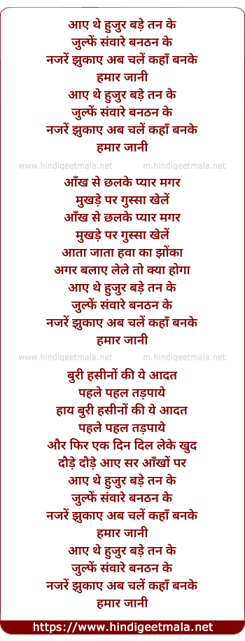 Lyrics of Aaye The Huzoor Bade Tan Ke (Male) - आए थे हुजुर बड़े तन के