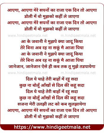 Lyrics of Aayega, Aayega Mere Sapano Kaa Raja - आएगा, आएगा मेरे सपनों का राजा