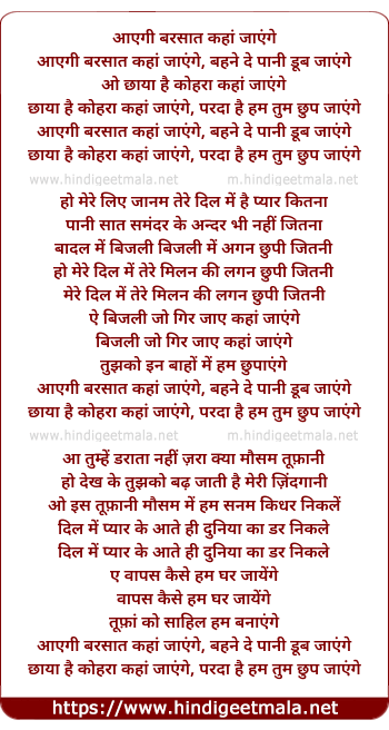 Lyrics of Aayegi Barsat Kaha Jayenge - आयेगी बरसात कहां जायेंगे