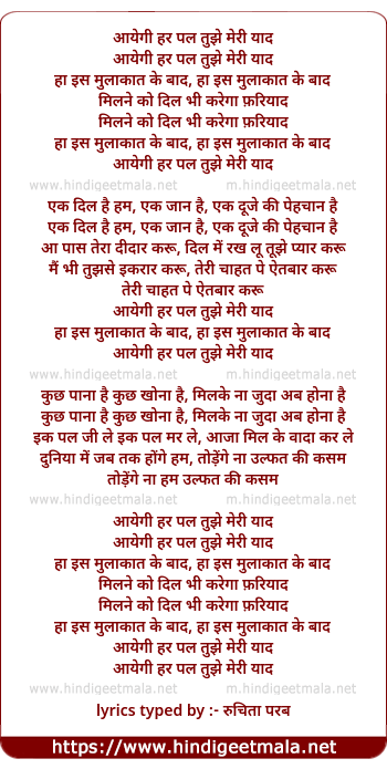 Lyrics of Aayegi Har Pal Tujhe Meri Yaad - आयेगी हर पल तुझे मेरी याद