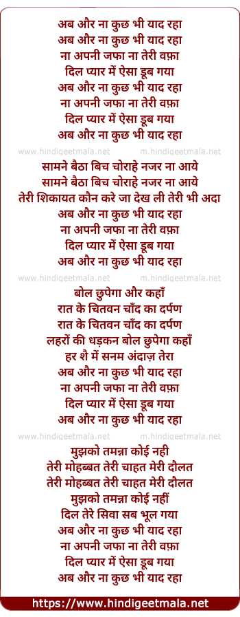 Lyrics of Ab Aur Na Kuch Bhi Yaad Raha - अब और ना कुछ भी याद रहा