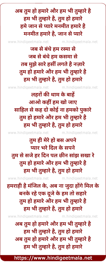Lyrics of Ab Tum Ho Hamare - अब तुम हो हमारे