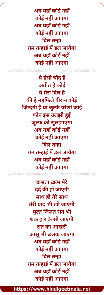 Lyrics of Ab Yaha Koi Nahi Aayega - अब यहाँ कोई नहीं आएगा
