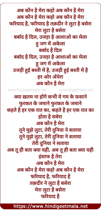 Lyrics of Abb Kaun Hai Mera Kaho - अब कौन है मेरा कहो