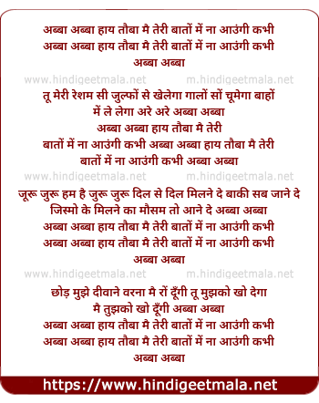 Lyrics of Abba Abba Haye Tauba, Mai Teri Baato Me Na Aaungi Kabhi - अब्बा अब्बा हाय तौबा, मैं तेरी बातों में ना आऊँगी कभी