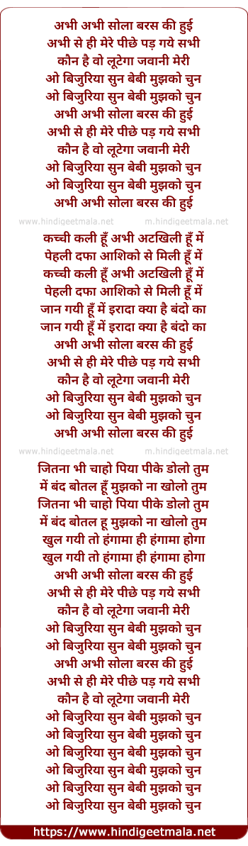 Lyrics of Abhi Abhi Solah Baras Ki Hui - अभी अभी सोला बरस की हुई
