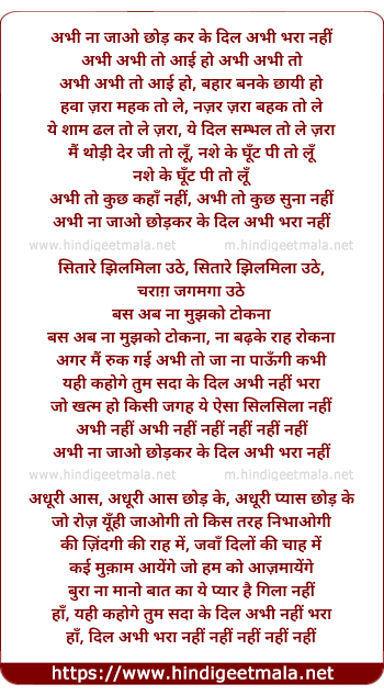 Lyrics of Abhi Na Jaao Chhod Kar, Ke Dil Abhi Bhara Nahin - अभी ना जाओ छोड़ कर, के दिल अभी भरा नहीं