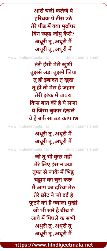 Lyrics of Adhuri Tu Adhura Main - अधूरी तू अधुरा मैं