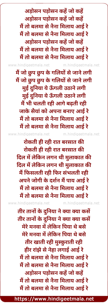 Lyrics of Adosan Padosan Kahe Jo Kahe, Main To Balma Se Naina Milay Aayi Re - अड़ोसन पड़ोसन कहें जो कहें, मैं तो बलमा से नैना मिलाय आई रे