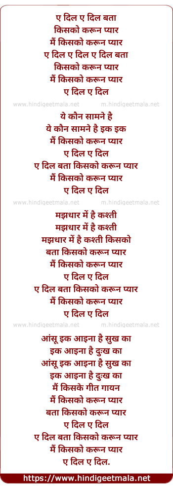 Lyrics of Ae Dil Bata Kisko Karu Pyar - ए दिल बात किसको करू प्यार