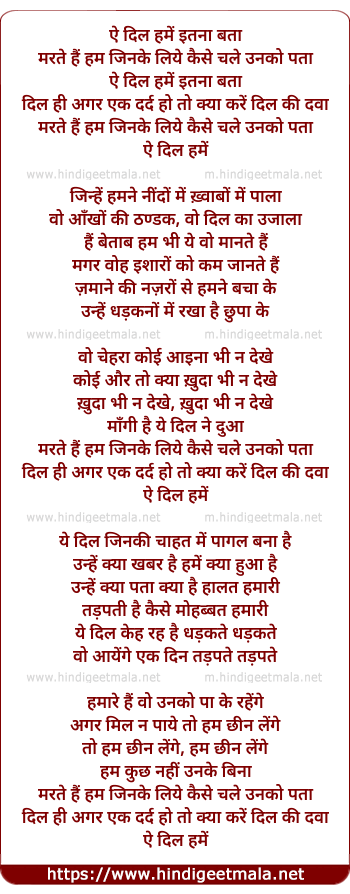 Lyrics of Ae Dil Hame Itna Bata - ऐ दिल हमें इतना बता