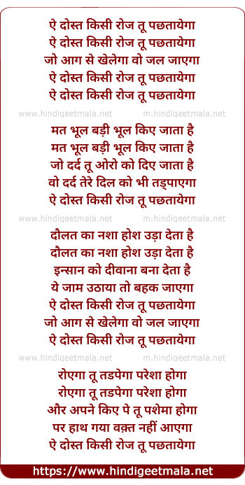 Lyrics of Ae Dost Kisi Roz Tu Pachtayega, Jo Aag Se Kehlega Wo Jal Jaayga - ऐ दोस्त किसी रोज तू पछतायेगा, जो आग से खेलेगा वो जल जाएगा