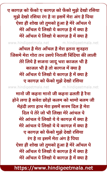 Lyrics of Ae Kagaz Ko Phenko Mujhe Dekho Rasiya - ए कागज़ को फेंको मुझे देखो रसिया