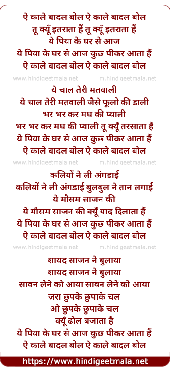 Lyrics of Ae Kale Badal Bol - ऐ काले बादल बोल