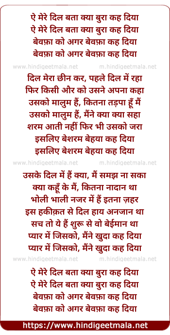 Lyrics of Ae Mere Dil Bata Kya Bura - ऐ मेरे दिल बता क्या बुरा कह दिया