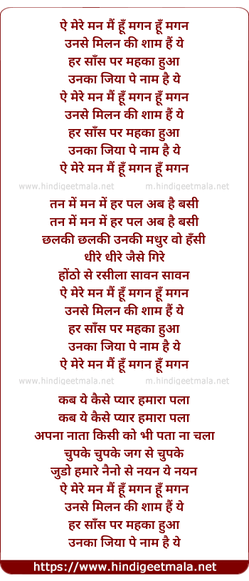 Lyrics of Ae Mere Man Mai Hu Magan - ऐ मेरे मन मैं हूँ मगन