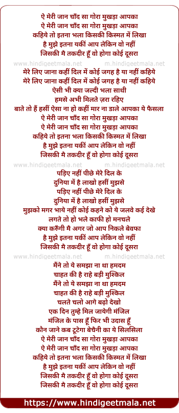 Lyrics of Ae Meri Jaan Chand Sa Gora Mukhda - ऐ मेरी जान चाँद सा गोरा मुखड़ा