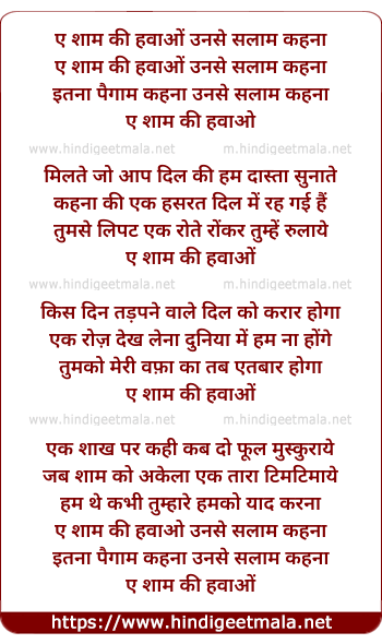 Lyrics of Ae Sham Ki Hawao Unse Salam Kahna - ए शाम की हवाओं उनसे सलाम कहना