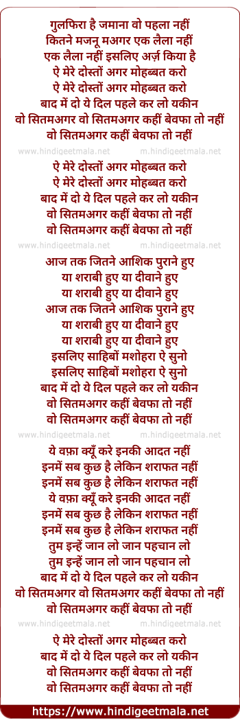 Lyrics of Ae Mere Dosto Agar Mahobbat Karo - ऐ मेरे दोस्तों अगर मोहब्बत करो