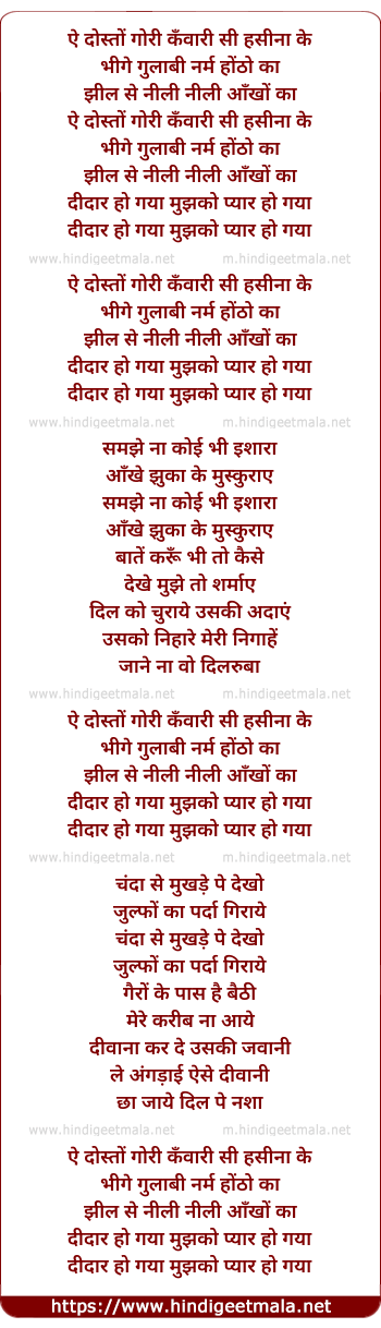 Lyrics of Ai Dosto Gori Kanvaari Si Hasinaa Ke, Didaar Ho Gayaa - ऐ दोस्तों गोरी कँवारी सी हसीना के, दीदार हो गया