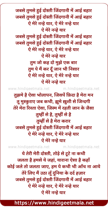 Lyrics of Ai Mere Nanhe Yaar - ऐ मेरे नन्हे यार