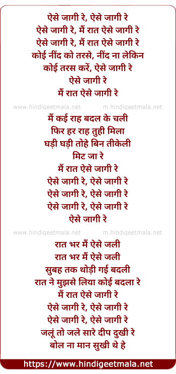Lyrics of Aise Jaagi Re - ऐसे जागी रे, ऐसे जागी रे