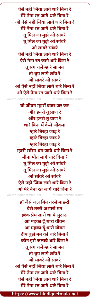 Lyrics of Aise Nahi Jiya Laage - ऐसे नहीं जिया लागे थारे बिना रे