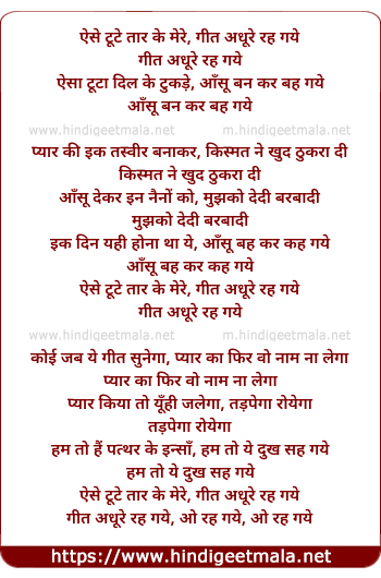 Lyrics of Aise Tute Tar Ke Mere, Geet Adhure Rah Gaye - ऐसे टूटे तार के मेरे, गीत अधूरे रह गये