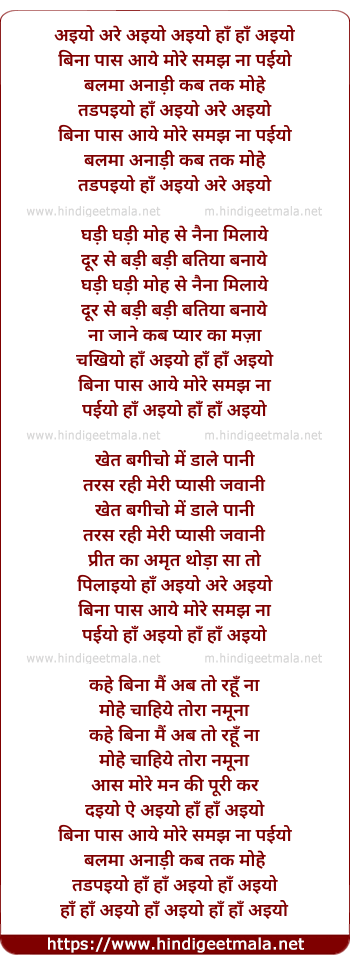 Lyrics of Aiyo Arre Aiyo Bina Paas Aaye More - अइयो अरे अइयो बिना पास आये मोरे