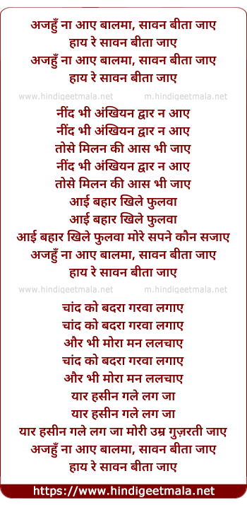 Lyrics of Ajahun Naa Aaye Baalamaa Saavan Bitaa Jaae - अजहुँ ना आये बालमा, सावन बीता जाये