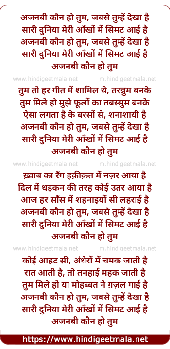 Lyrics of Ajanabi Kaun Ho Tum, Jabase Tumhen Dekhaa Hai - अजनबी कौन हो तुम, जबसे तुम्हें देखा है