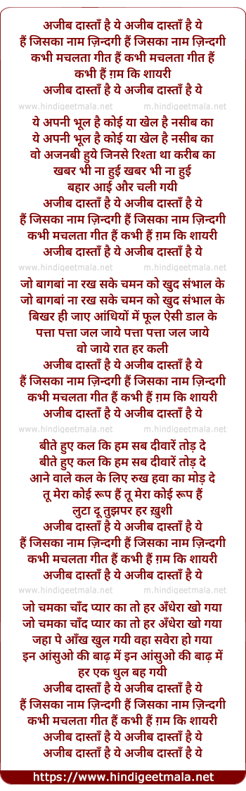 Lyrics of Ajeeb Dastan Hain Yeh - अजीब दास्ताँ है ये