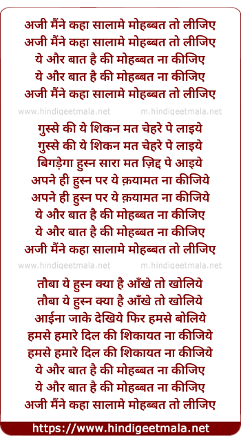 Lyrics of Aji Maine Kaha Salame Mohabbat - अजी मैंने कहा सालामे मोहब्बत