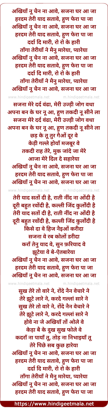 Lyrics of Akhiya Nu Chain Na Aave, Sajna Ghar Aa Ja - अखियाँ नू चैन ना आवे, सजना घर आ जा
