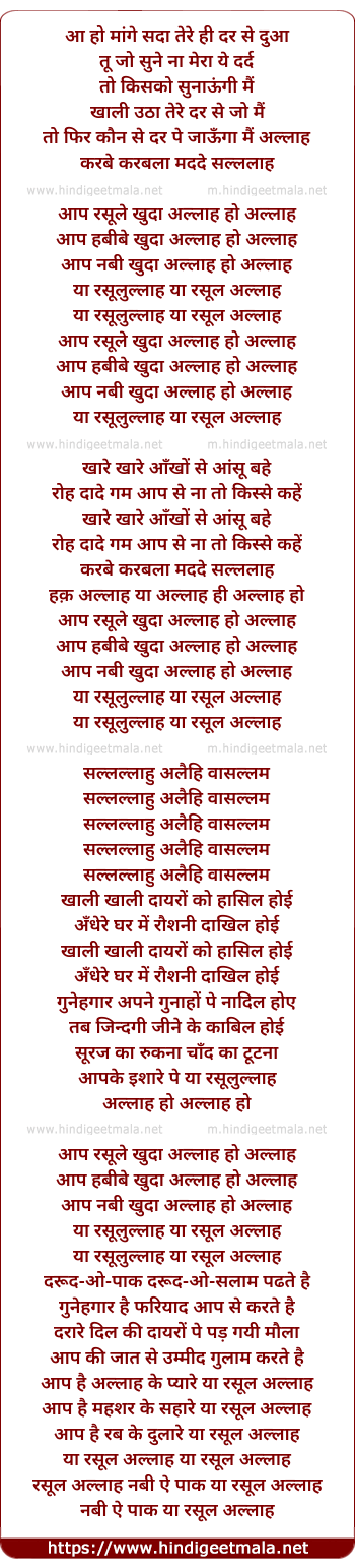Lyrics of Allaah Hu Allaah - अल्लाह हूँ अल्लाह