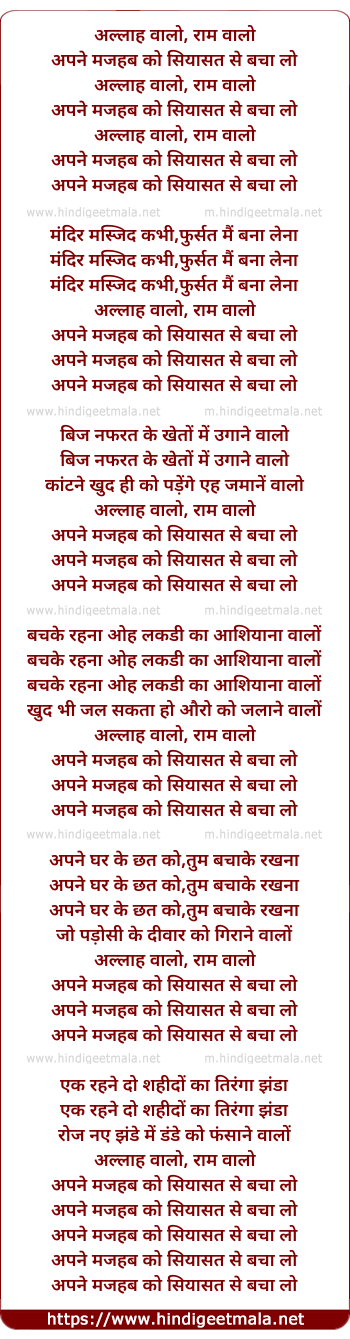 Lyrics of Allaah Waalo, Raam Waalo - अल्लाह वालो, राम वालो