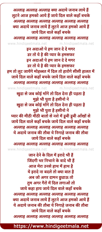 Lyrics of Allah Allah, Kya Adaye Janab Laye Hai - अल्लाह अल्लाह, क्या अदाये जनाब लाये हैं