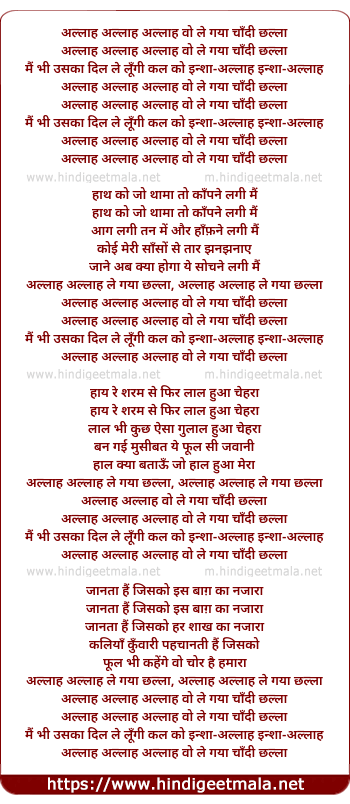 Lyrics of Allah Allah Allah Wo Le Gaya Chaandi Challa - अल्लाह अल्लाह अल्लाह वो ले गया चाँदी छल्ला