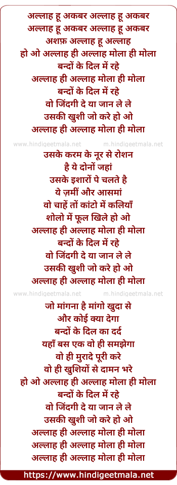Lyrics of Allah Hu Akbar - अल्लाह हू अकबर